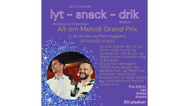 Du kan glæde dig til en aften fyldt med musik og anekdoter, når Bryan og Mads byder indenfor bag kulisserne på DMGP. Bryan, der har deltaget som både sanger og sangskriver i DMGP, deler sine oplevelser fra scenen og arbejdet med musikken. Mads, der har været en del af den visuelle produktion både til det danske og internationale Melodi Grand Prix, giver et spændende indblik i, hvordan det store show bliver til. Det bliver en spændende aften, hvor musik og historier går hånd i hånd – og hvor du som gæst får en unik forståelse af, hvad der sker bag kulisserne.
