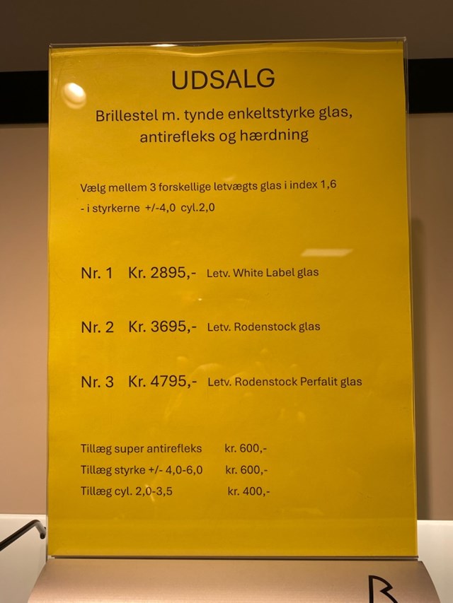 Derudover fås stel med enkeltstyrkeglas inkl. antirefleks og hærdning til priser fra 2.895 kr. – 4.795 kr. – ideelt for dem, der ønsker en solid brilleløsning uden at gå på kompromis.