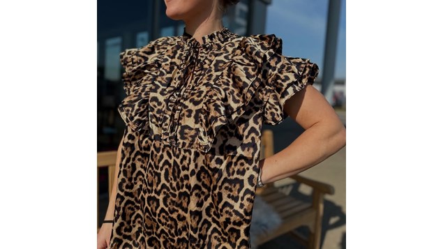 Den fine leopard kjole fra Stories From The Atelier har fine flæsedetaljer ved skuldrene og halsudskæringen. Det lette materiale og den løse pasform gør kjolen perfekt til både hverdagsbrug og festlige anledninger