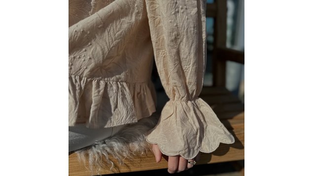 Den elegante bluse har en høj hals og fine flæsedetaljer, der tilføjer et feminint og tidløst udtryk.