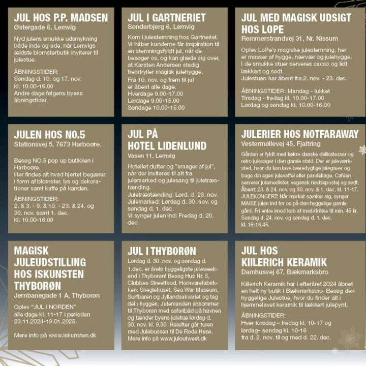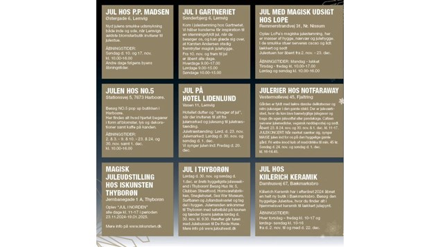 Så kommer der en flot oversigt over julerier i Lemvig Kommune og vi er naturligvis med I år bliver har vi fokus på bæredygtig jul, så delikatesserne er danskproduceret og af høj kvalitet, du kan lave en bæredygtig julegave i julegave værkstedet eller bage din selvvalgte julekage. Cafeen serverer medisterpølse med hj.lavet rødkål og brød eller vegansk nøddepostej med hj.lavet syltede grønne tomater på brød. Du kan få lækre varme drikke med sødt.