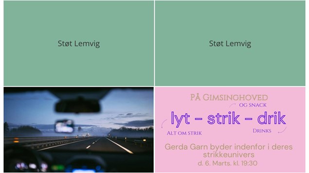 Gimsinghoved Kunst- og Kulturcenter afholder arrangementet "Snak, Strik og Snacks", hvilket tyder på en hyggelig aften med strikning og samvær.